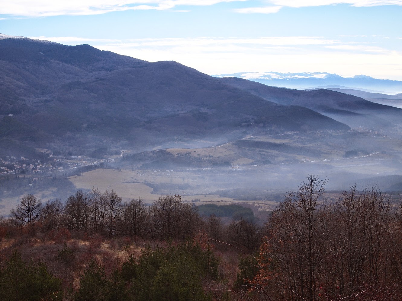 В късния декември долината е покрита с мъгла, над която в далечината се открояват заснежените върхове на Рила.