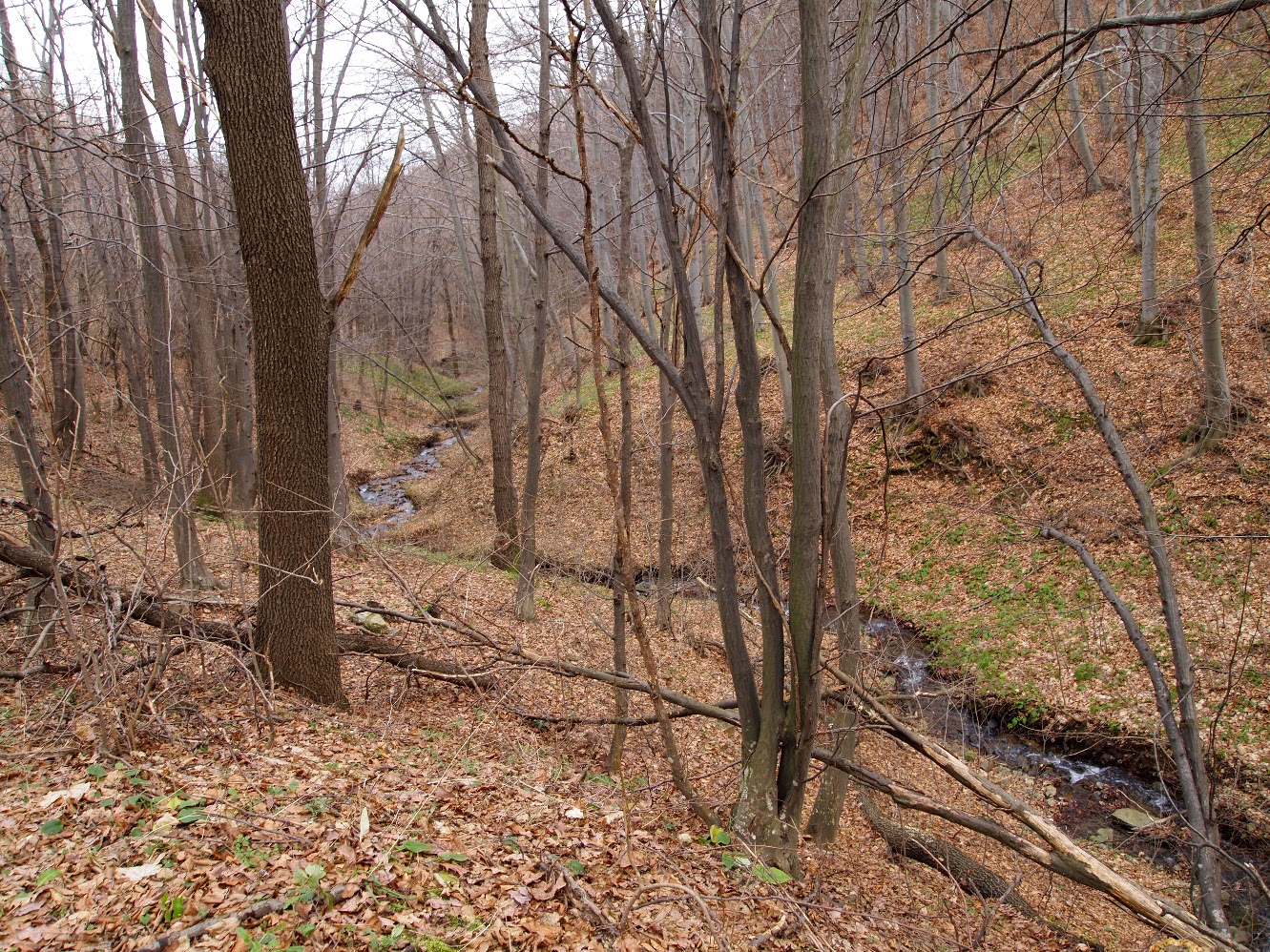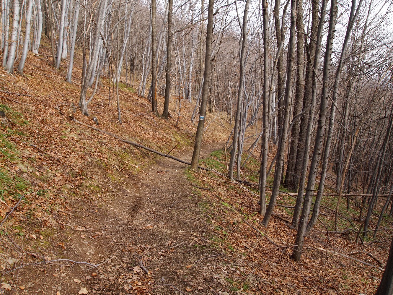 Точно в основата на стръмния склон се събират две основни пътеки - нагоре по следващия хълм към село Мало Бучино, нашата е надясно през гората надолу към хижа Бонсови поляни. В този участък има указателни табели и маркировка (синя ивица между две бели). Пътеката минава плавно надолу между широколистна гора