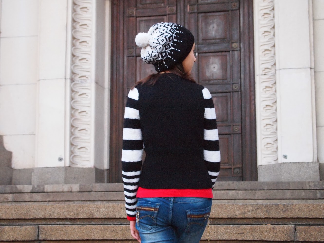 Gaby wanted a simple cardigan for school and liked the unostentatious and elegant geometric design of this Karen Millen block striped cardigan. I had my doubts in the course of knitting, actually at one point I was about to abandon the pattern altogether and to knit the Drops stranded cardigan that I used for the hat pattern. But now, that I see it done and worn, I'm glad I finished it and Gaby really likes it. This is how she wore it today to school (not exactly how I had planned this photosession, I would have preferred black jeans and a black top under the cardigan :)