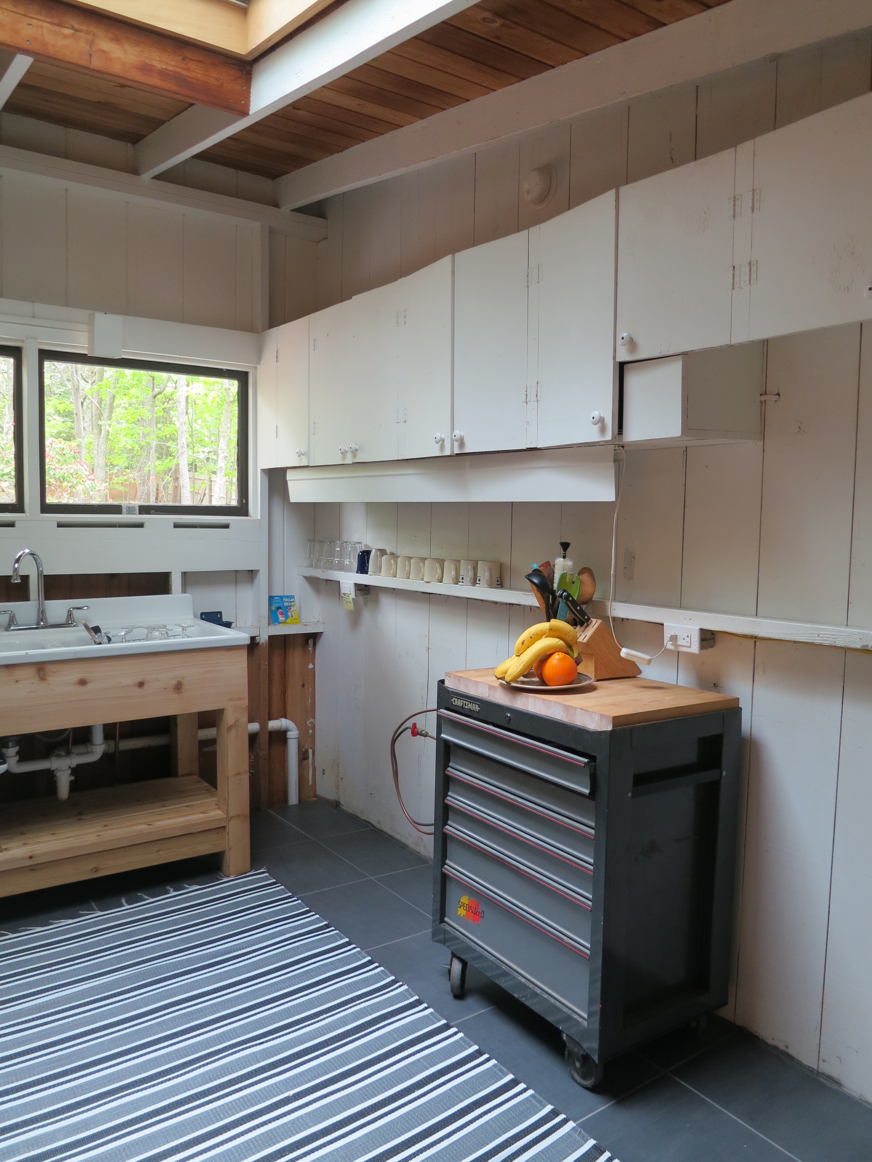 The kitchen is coming together. I’m using a Craftsman tool chest bought from the previous owner (for my son, but he hasn’t claimed it yet) as temporary drawers for silverware, linens, etc.