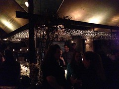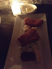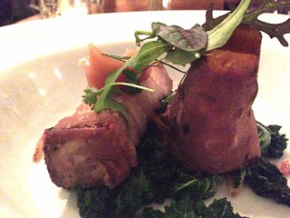 The restaurant was nice and cozy when we arrived. We quickly received the first course – a Medjool date, stuffed with Fourme d’ Ambert and wrapped in bacon. It was paired with a Méthode Champenoise Brut from Domaine St. Vincent (New Mexico). For us, bacon wrapped dates are a fave, so this was a nice take on a staple