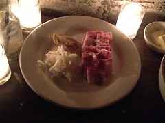 We then were served a seared yellowfin tuna, accompanied by maitake, gold beet, and fresh wasabi. It was paired with a Muscat – “Exsultate” Domaine du Chapitre from S. Rhone. The sear on the tuna was nicely done and I liked the pairing of beets and wasabi with the flavors of the tuna. It was a slightly unexpected combination but worked perfectly.