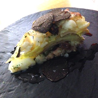 We then were served tortilla with bacalao and black truffle. I think bacalao was the only thing we had which made a repeat appearance. This was a Portuguese take on the Spanish staple Tortilla Española. The layers were nicely done and the stronger flavor of the bacalao stood up nicely to the prominent potato flavor. I was not sure what I would think on this one but I was surprised how much I liked it.