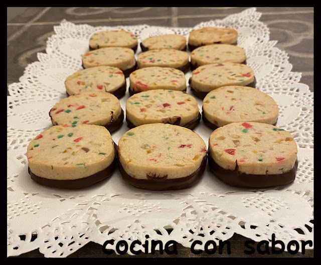 Las he hecho con los mismos ingredientes, lo único que he variado es que he puesto algo menos de azúcar, no he puesto esencia de vainilla y en vez de poner solamente naranja confitada las he preparado con fruta confitada variada: guindas, naranja y melón.