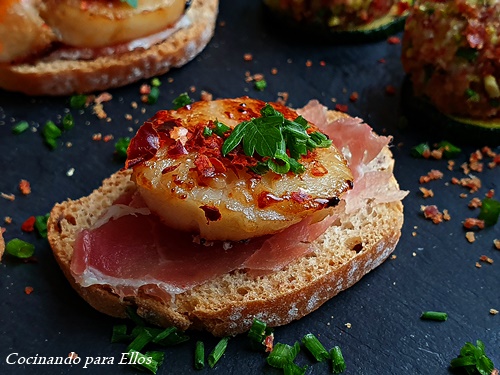 Sobre los panecillos colocamos el jamón en laminas pequeñas y finas y encima las vieiras espolvoreadas con el jamón crujiente y el pimentón, que el mío era picante, decoramos con el cebollino.