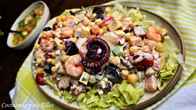 Una vez todo preparado ponemos la lechuga en la bandeja donde se vaya servir, encima los garbanzos, con el pulpo y gambas aliñados con una poca salsa, poniendo en el bol el resto de la salsa para que cada uno se sirva a su panera.