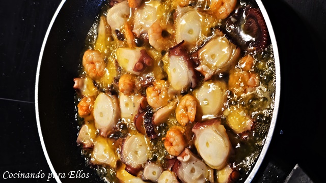 Picamos el pulpo en rodajas, los langostinos limpios.