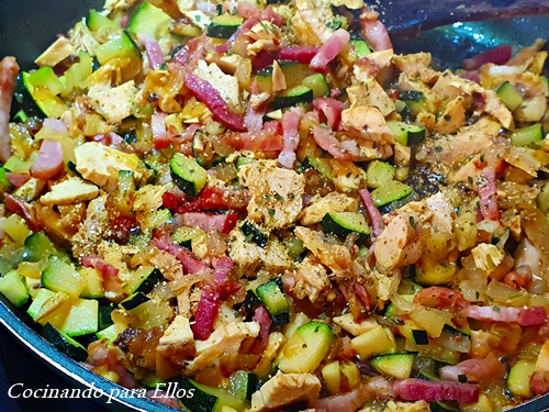 Ponemos una sartén al fuego con un chorro de aceite, donde pocharemos la cebolla ligeramente salpimentándola, añadiendo el beicon dejando freír unos 5 minutos y luego el resto de verduras, finalizando con el pollo y el ajo seco, mezclamos todo dejando que se mezclen los sabores 2-3 minutos y retiramos del fuego, ponemos en un colador las verduras para escurrir el exceso de aceité.