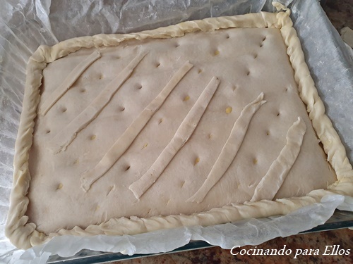 Pinchamos el hojaldre con la punta de un cuchillo, por toda la superficie, pintamos con el huevo batido todo el hojaldre por encima.