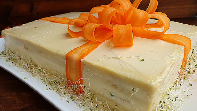 Cubrimos la tarta que tenemos en la nevera, con la mayonesa y queso que tenemos reservado, por encima y por los lados, alisándola bien con una espátula, colocamos las laminas de las zanahorias como si fuéramos hacer un paquete, para hacer los lazos le ponemos un pegote de queso en el medio del lazo donde vamos pinchado con la zanahoria para hacer los lazos......es muy sencilla de hacer aunque no os lo parezca...