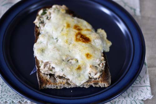 Spoon the tuna onto each of the 2 bread slices and top with the cheese. Heat in the oven until heated through and the cheese is melting. I also gave it a few minutes under the broiler to brown the cheese. Enjoy!