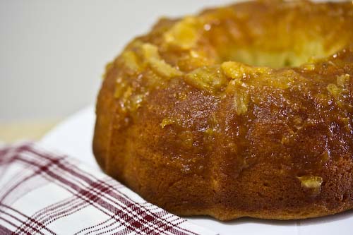 Remove the cake from the oven and immediately turn it from the pan onto a serving plate. Pour the glaze over the hot cake. Cool the cake and dust with confectioner's sugar before serving.