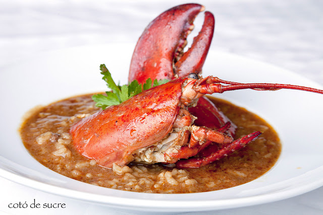Se salen totes les parts del llomàntol i es fregeixen lleument (primer per la part de la closca). Es reserven i en el mateix oli se sofregeix la ceba fins que quedi fosca i ben cuita, gairebé com una melmelada. A mesura que es fa el sofregit es pot anar salant. S'hi afegeix la barreja triturada d'all, pebrot verd i vermell i les tomaques pelades i se sofregeix tot fins que quedi tot ben fregit i reduït. Al final s'hi afegeix una mica de pebre vermell picant, es remena, s'hi posa el conyac i es deixa reduir. Es fa una picada amb els alls, les ametlles torrades, els pinyons i el julivert i es tritura amb una mica de caldo. S'aboca a la cassola i se sofregeix una estoneta. S'hi afegeix el caldo i es fa bullir 5 minuts. Ara ja es pot afegir l’arròs, els caps i les pinces dels llomàntols. Es rectifica de sal. Quan faltin uns 6 o 7 minuts per acabar de coure's l’arròs s'hi afegieix el suc dels llomàntols i les cues. Si convé, s'hi afegeix més caldo.