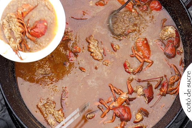 A l’hora de fer un arròs, hi ha gent que té la seva particular superstició. Posar l’arròs en forma de creu abans d’abocar-hi l’aigua o caldo ben calent, comptar la mesura exacta d’una tassa d’arròs per dues d’aigua... Nosaltres, en principi, no en tenim cap, l’única dèria que tenim és fer un sofregit ben fet. És a dir, un sofregit en què tots els ingredients (ceba, all, tomaca, pebrot, etc.) estiguin ben cuits abans d’afegir-hi l’arròs. No ens agrada gens trobar-nos els trossos de ceba i tomaca crus reballant per entremig de l’arròs. I en el cas de l’arròs d’avui encara és més important perquè es tracta d’un arròs caldós i encara és pitjor trobar-nos el sofregit mig cru i flotant.