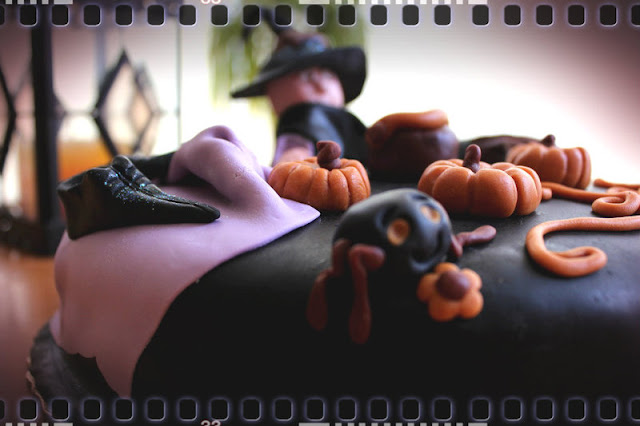 No resto da decoração usei pasta de açúcar preta, depois de trabalhada cortei os corações com a ajuda de cortadores para bolachas, perfurei-os e colei-os à superfície com o CMC. Finalizei com purpurinas alimentares.