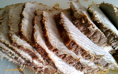 Depois, abra com cuidado, retire apenas e carne e corte-a em fatias. Reserve.
