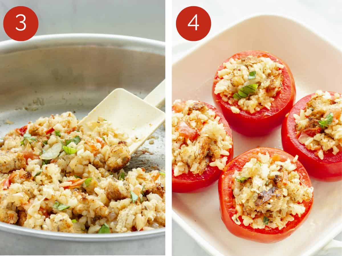 - Prepare the stuffing. Heat the olive oil in a saute pan over medium high heat. Add the onions and chopped tomato pulp and saute for about 3 minutes or until the onions start to turn golden and any juice from the tomatoes has evaporated.