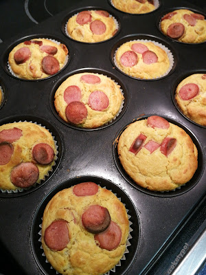 165 gr de harina de maíz (no es maizena), 60 gr de harina normal, 1 cucharada de azúcar moreno, 2 cucharaditas de levadura en polvo,1 cucharadita de sal ,½ cucharadita de bicarbonato, 250 ml de leche con un chorreón de limón; 2 cucharadas (26 gr) de mantequilla sin sal, 1 huevo grande,1 taza (250 gr) de queso rallado, 5 salchichas tipo viena. Papeles para magdalenas.