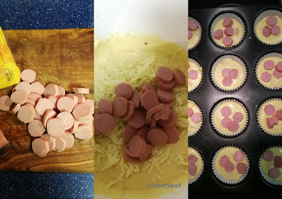 Si tenemos una placa para magdalenas, colocamos en cada hueco un papel, y rellenamos con la mezcla hasta la mitad y podremos por encima el resto de las salchichas.