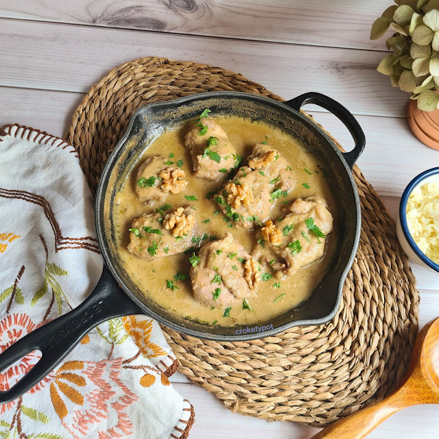 Este guiso, en cierto modo recuerda a nuestro pollo en pepitoria, lo suelen preparar con pollo o pavo, es típico tomarlo frío, en picnic y en navidad no suele faltar. Lo elaboran con una base de caldo de pollo muy concentrado, por ello he utilizado caldo de puchero Aneto, si no tenéis a mano podéis poner caldo casero que es bien rico.