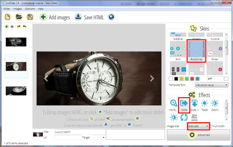 La delicadeza de este deslizador lo hace ideal para los sitios web de lujo y los proyectos de moda. La apariencia ofrece un toque moderno y el ancho sostenedor para la imagen otorga un gran espacio para la promoción de cualquier elemento. Como la demo sugiere, los relojes y los accesorios finos tomarían muchas ventajas de este deslizador y oscurecería de buena manera los sitios web. Se puede utilizar un gran número de efectos de transición con este deslizador para ayudarlo a adaptarse a cualquier sitio web que lo incorpore.