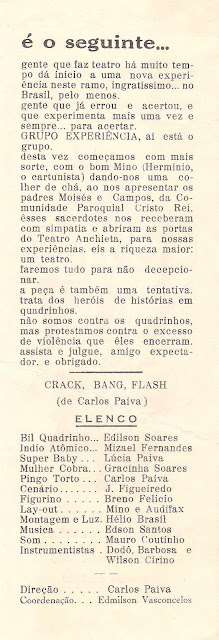 No meu "currículo teatral" , a peça que mais deixou-me saudades foi a infantil "Crack, Bang, Flash". Este título, seria a onomatopeia dos sons produzidos, num ato de violência física, por indivíduos aos socos recíprocos... digamos assim!!!...Essa peça, foi escrita por meu irmão Carlos Paiva,"inspirada" em histórias de quadrinho da época: década de 1960. A temporada dessa peça foi EXCEPCIONAL, com "casa" sempre cheia, aos sábados e domingos,no Teatro Anchieta, na Rua Gonçalves Ledo, 88, no bairro Aldeota. No espetáculo,, eu fazia um personagem menino - o Super Baby. Era tal, o "sucesso", que fui convidada, pelo publicitário Tarciso Tavares( o querido TT - amigo desde a BA 232, que morava na casade nº 200 da BA...), para fazer uma propaganda da loja Ocapana, de roupas infantis, "ao vivo", em preto e branco, na TV CEARÁ.