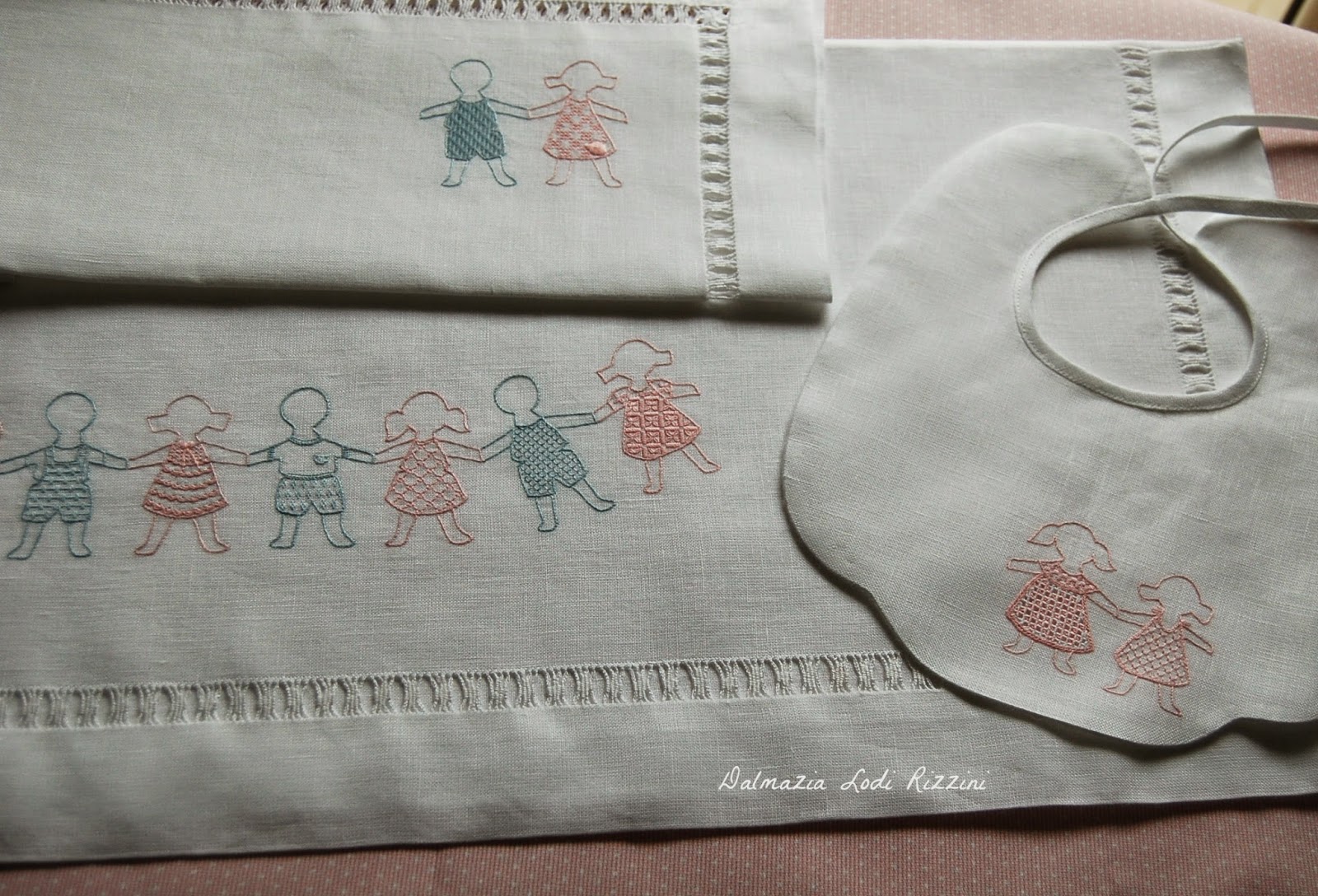 puro lino Sotema 30L trama regolare 18 fili per questo lenzuolino da carrozzina e bavaglino ricamati con retini di fondo