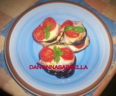 Ripetete l'operazione altre 2 volte.Continuate con altre melanzane,finche' le finite.Ponete in forno,a 180°,per circa 5/6 minuti,il tempo di far sciogliere i formaggi e dorare il prosciutto.Guarnite con il basilico fresco e servite tiepide.