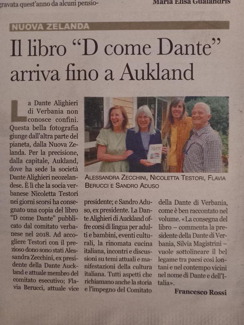 to our Auckland branch. In the foto from left: Alessandra Zecchini, Dante Auckland former president and current committee member, Nicoletta Testori, Dante Verbania, Flavia Berucci, Dante Auckland vice-president, and Sandro Aduso, Dante Auckland former president.