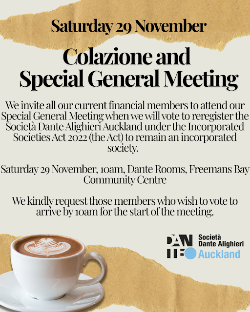 for the Special General Meeting of the Società Dante Alighieri Auckland, 10am, and the opening of the photographic exhibition Italians of Auckland, by Francesca Brugnoli.