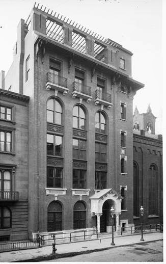 | The entrance portico was a near-match to that of the church (the church building can be seen to the right). The extensive pergola on the roof is seen in this photograph taken shortly after the building's completion -- photograph by Wurts Bros. from the collection of the Museum of the City of New York http://collections.mcny.org/Collection/30-East-31st-Street.-Madison-Avenue-Baptist-Church.-2F3XC52X72.html |