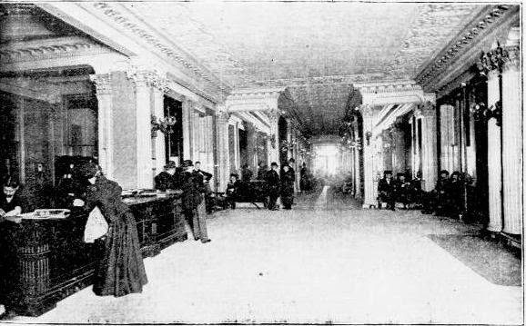 | On March 4, 1900 the New-York Tribune pictured the second floor foyer with its frescoed ceiling (above) and the lobby (copyright expired) |
