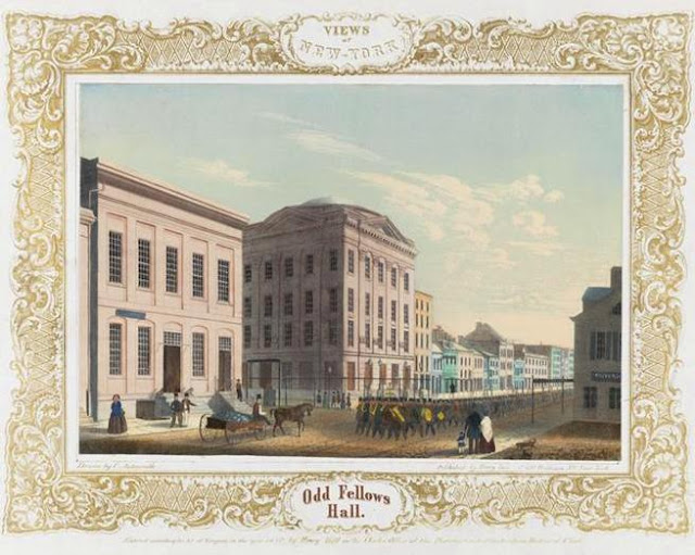 | The neighborhood around Odd Fellows' Hall was romantically depicted by Charles M. Autenreith's watercolor later in the century --from the collection of the Museum of the City of New York |