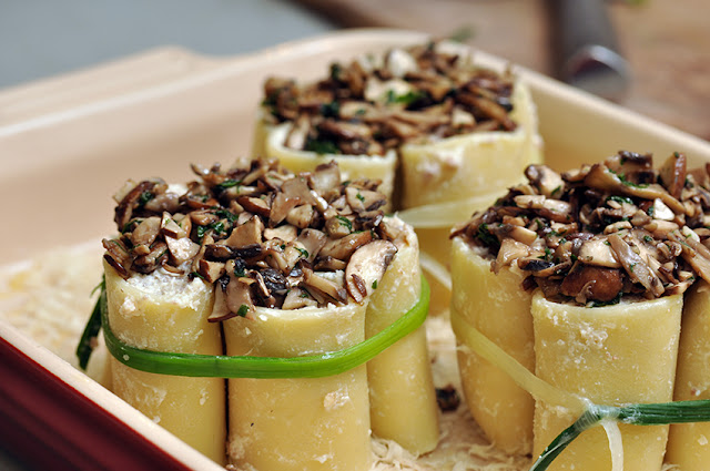 Letzte Woche sind sie mir bei der Suche nach Spaghetti in die Hände gefallen und da habe ich sie nicht mehr losgelassen. Paccheri sehen aus wie halbierte Cannelloni und sind wie geschaffen dafür, um gefüllt zu werden. Beim ersten Mal habe ich sie liegend in eine Form geschichtet, beim zweiten Mal habe ich sie - für Gäste - stehend (und mit einem blanchierten Porreestreifen umwickelt) gebacken, weil das einfach netter aussieht. Beide Varianten schmecken ausgezeichnet.