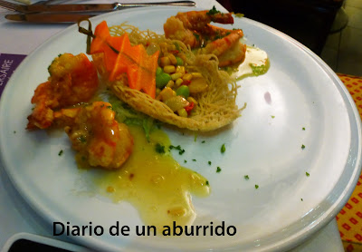 De segundo, un nido de tallarines tostados con unos scampi: Debo decir que sacaron el mejor partido posible de esa cosa fibrosa que se da en llamar "scampi" y que no estoy muy seguro que no sea plástico reciclado o algo así.