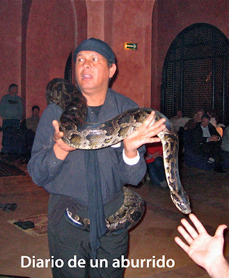 Pobre serpiente, aguantando que los turistas la molesten en un establecimiento hotelero de la isla de Djerba. En cambio, ésta otra, en un restaurante de Marraquech, tiene un aire más malvado. Bueno, si no ella, a la que no se le ven los ojillos, sí su papá, que convendréis conmigo que tiene un aire más agresivo que el tunecino.