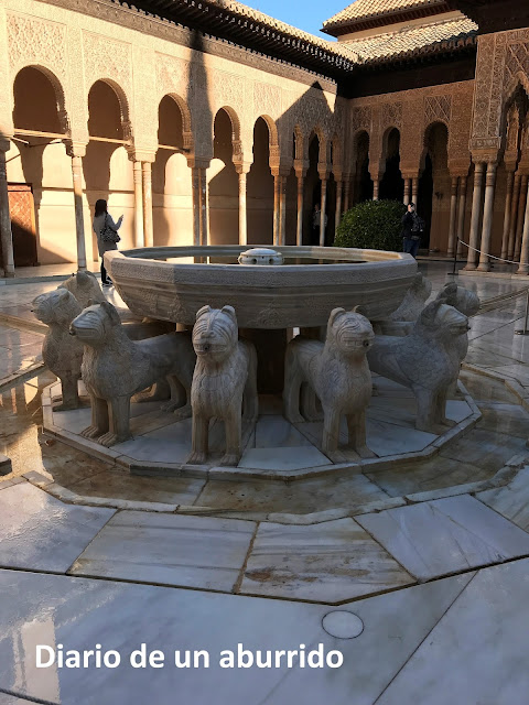Por cierto, que yo no lo sabía, los arrayanes son esos arbustos que rodean la piscina. Tras las explicaciones de la guía y esas cosas, se pasa al patio de los leones: