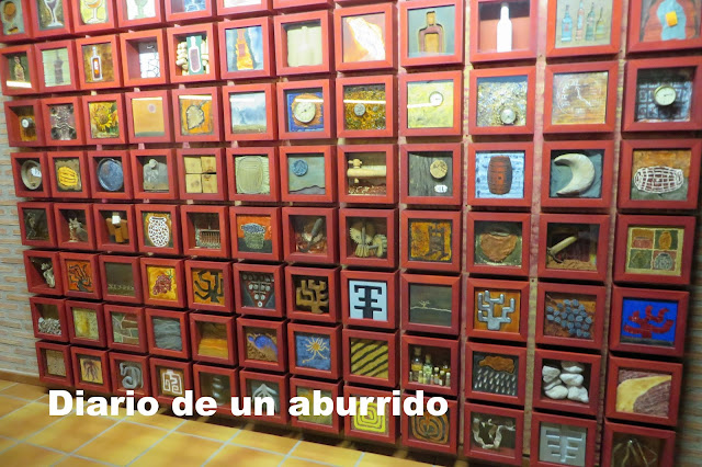 Enate empezó en 1992, y desde su origen ha estado ligado al mundo de la pintura y del arte: en esta tabla, se pueden ver las diferentes etapas de la fabricación del vino: vendimia, fermentación, etc. Cada añada y cada cepa tiene una etiqueta pintada por un pintor conocido, casi todos aragoneses. Los originales de las etiquetas están en una sala exposición, pero ¡Ay!, mi guía fue tajante, en esa sala no se pueden hacer fotos.