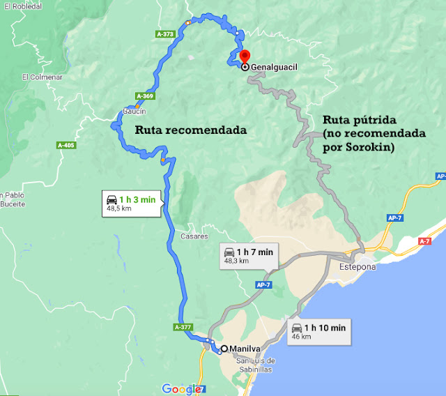 Google recomienda, o más bien propone, dos rutas desde Manilva, que es donde nuestros espíritus fatigados se solazaban.