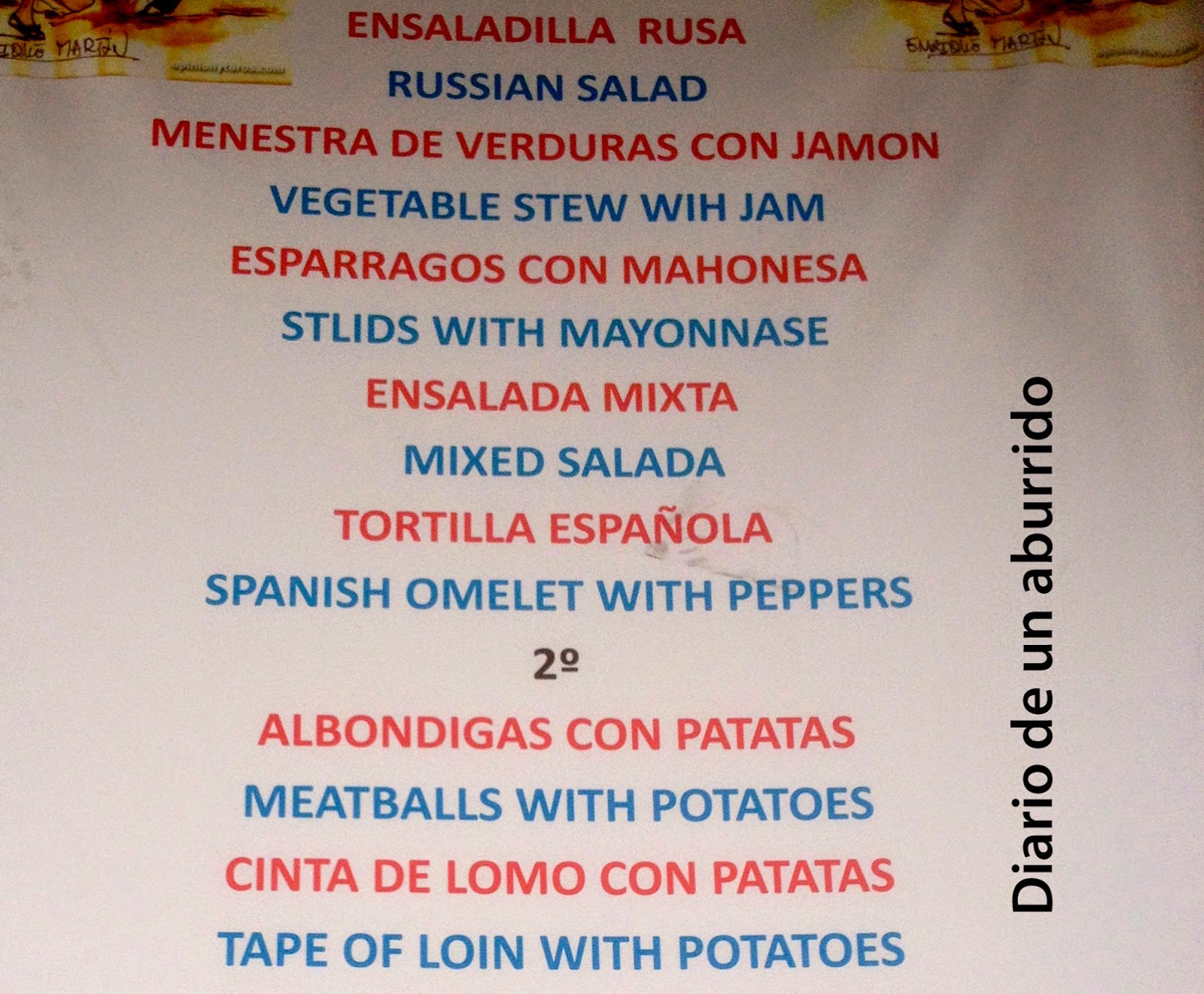 Y ya puestos a hablar de traducciones, he aquí las traducciones al inglés que ví en una taberna de Madrid: