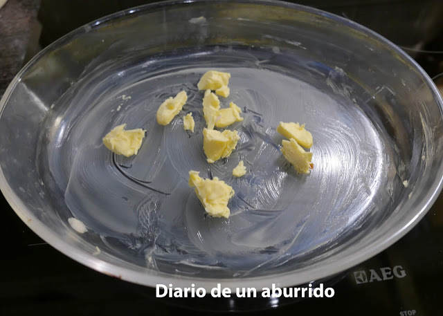 En una fuente para el horno, primero frotáis con el ajo y la embadurnáis muy bien de mantequilla (aquí, nada de aceite de oliva)
