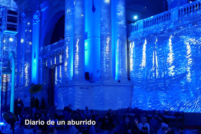 Una vez que cruzas el umbral, te sacuden unas imágenes que se proyectan en las paredes de la sala, que es enorme. La música te invade por todas partes. Os lo digo en serio, es una experiencia apasionante. El público está por el suelo, en colchonetas, en hamacas o en sillas: