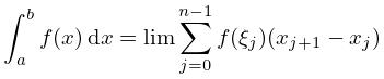 Suppose f(x) is defined on [a,b]. Let a=x0<x1<<xn=b, and ξj denote any point in [xj,xj+1], j=0,1,,n1. Then