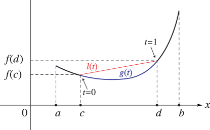 Figure 1.4.2: Convex function f(x). g(t)=f((1t)c+td), l(t)=(1t)f(c)+tf(d), c,d(a,b), 0t1. Magnify