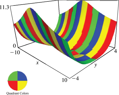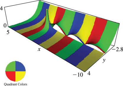 In the graphics shown in this subsection, height corresponds to the absolute value of the function and color to the phase. See also p. About Color Map.