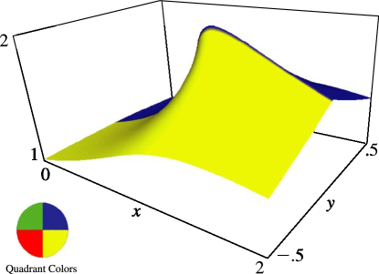 In Figures 15.3.5 and 15.3.6, height corresponds to the absolute value of the function and color to the phase. See also About Color Map.