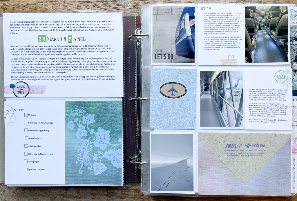 Uppslag 1. Till vänster har jag ett stort kort med journaling om förberedelserna inför resan, som är dekorerat med alfabetsstickers, stämplar (månadernas namn, men “till” har jag skrivit för hand), rund stämpel på vellum (där “Japan” är handskrivet), pil och en bit washi som jag köpte i Japan. På kortet under har jag en att-göra-lista med stämplade rutor, text och runda stämplar. En stor bit mönstrat papper sitter som fillerkort.