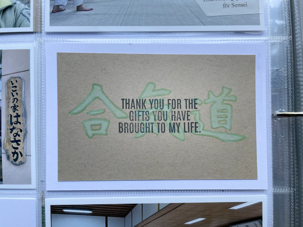 Jag duttade grön Distress Ink genom en stencil för att få de japanska tecknen (kanji) för “Aikido”, och så ritade jag längs konturerna med en grön penna. På detta stämplade jag i svart. Den texten är extra passande, då en av lärarna i Japan säger att han ser utmaningar och jobbiga saker som gåvor (gifts), eftersom det är genom dem man lär sig och växer, och att han varje morgon tackar för de gåvor som dagen kommer att bära med sig. Jag blev jätteglad när jag “hittade” denna textstämpel i min stämpelsamling, det är väldigt tillfredsställande när något passar så perfekt.