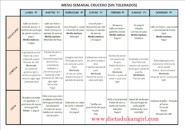 Hola amig@s dukanian@s: Ahora que ya ha acabado el verano y que muchas personas han vuelto al rĂ©gimen , se me ocurriĂł que podrĂa serles Ăştil este menĂş para fase crucero,la cual es a modo orientativo, vosotr@s podĂ©is cambiar cualquier plato dependiendo de vuestros gustos. En este menĂş hemos prescindido de los tolerados, ya que justamente tambiĂ©n está pensado para aquellas personas que están estancadas.