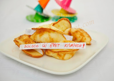 Folytatom a szilveszteri-újévi szerencsehozó sütemények sorozatát az igazi szerencsesütivel. Amivel az elején épp eleget szerencsétlenkedtem is, mert nem akartak szépre sikerülni, de aztán menet közben rájöttem egy-két stikára, úgyhogy eléggé elfogadhatóak lettek,bár még messze álltak a tökéletestől. Pl. fontos, hogy az "összeragasztásnál" csak a korongok széleit nyomkodjuk össze, mert így a belsejük szép domború marad, és szépen ráhajlik a csészére, illetve könnyebben megkapja jellegzetes formáját. No, de jöjjön a recept, és akkor talán érthetőbb lesz minden. :)